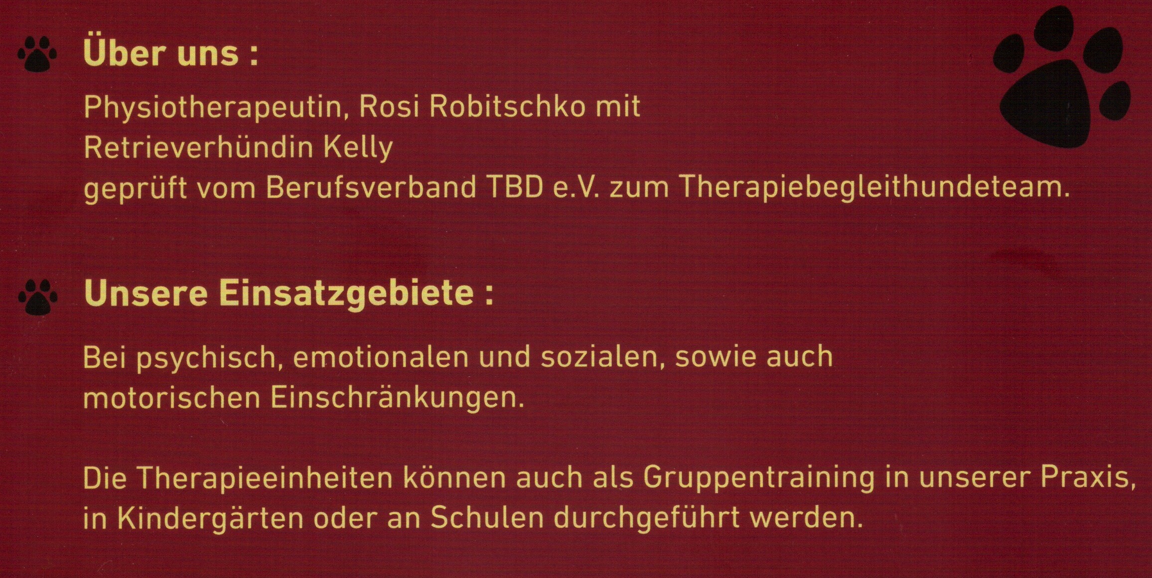 Die therapeutisch positive Wirkung von Tieren auf Menschen ist bekannt und erwiesen. Sie wurde in den letzten Jahren immer gezielter eingesetzt und hat ihre heilende Wirkung bei den verschiedensten Krankheitsbildern bewiesen. Tiergestützte Therapie umfasst alle Maßnahmen, bei denen durch den gezielten Einsatz eines Tieres positive Auswirkungen auf das Erleben und Verhalten von Menschen erzielt werden sollen. Dies gilt für körperliche wie seelische Erkrankungen. Das Therapiepaar Mensch/Tier fungiert als Einheit. Therapeutische Elemente sind emotionale Nähe, Wärme und die unbedingte Anerkennung durch das Tier. Tiergestützte Therapieverfahren sind alternativmedizinische Behandlungsverfahren zur Heilung oder zumindest Linderung vieler Krankheitssymptome. Unser Studio bietet diese tiergestützte Therapie an, denn unsere langjährige Mitarbeiterin Rosi Robitschko hat sich mit ihrer Retrieverhündin Kelly aller erforderlichen Prüfungen unterzogen und ist als Physiotherapeutin und Teamführerin Geprüftes Mitglied im TBD e. V. ( Therapiebegleithunde e. V. ) Diese vom TBD anerkannte Ausbildung ermöglicht und erlaubt ihr und Kelly die Arbeit mit Patienten. Die Arbeit ist für einen Hund sehr anstrengend und fordert von ihm viel Konzentration. Er muss sich voll auf seinen Besitzer verlassen können,er muss sich ständig auf neue Patienten einlassen und seine Flexibilität und Sensibilität beweisen. Welches sind nun die spezifischen Einsatzgebiete von Kelly? Rosi und Kelly werden Kinder mit orthopädischen, chirurgischen oder neurologischen Krankheitsbildern betreuen. Die Behandlungen können als Gruppentraining in unserer Praxis, in Kindergärten oder in Schulen durchgeführt werden. Bei Interesse/Fragen nehmen Sie einfach Kontakt mit uns auf.